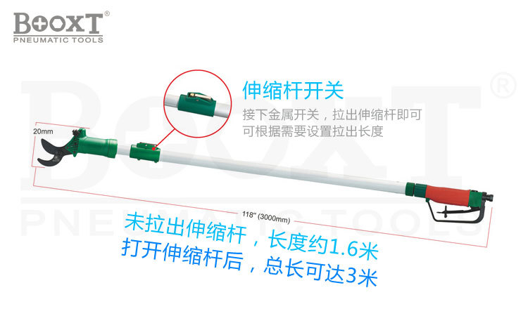 • 產品參數: 剪切能力:25mm;默認長度:1.6米,最長:3米(打開伸縮桿后);桿直徑:30mm,握把直徑:36mm;使用氣壓:6.3kgf/cm;推薦使用氣管:12*8mm;凈重:1.72kg;毛重:2.46kg;耗氣量:0.073L/次