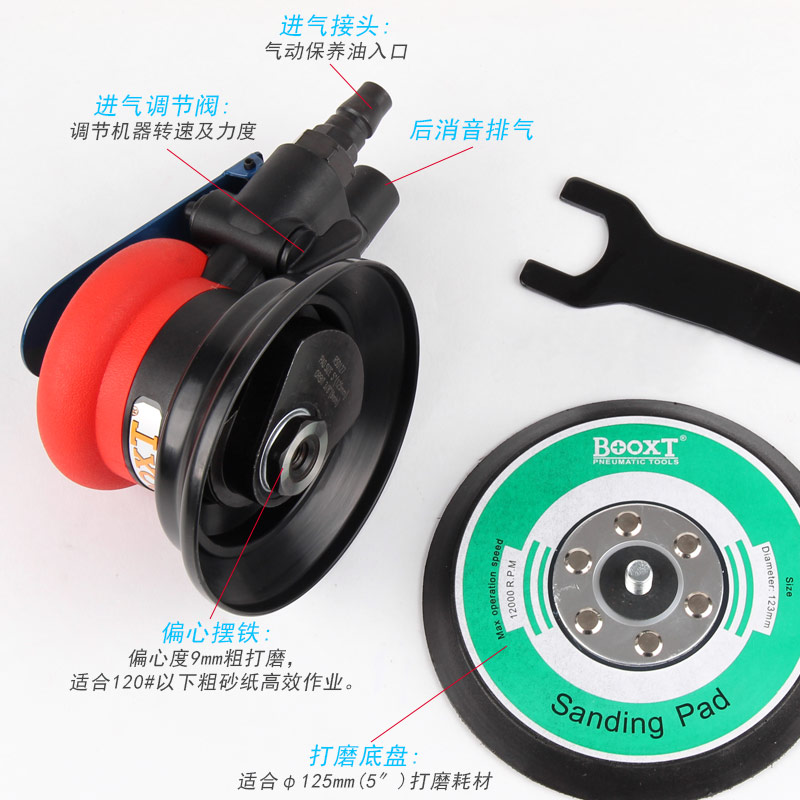 • 產(chǎn)品參數(shù): 底盤尺寸:125mm 空載轉(zhuǎn)速:11000rpm 偏擺直徑:9mm 重 量:0.9kg 耗 氣 量:1.6cfm/min(粗磨