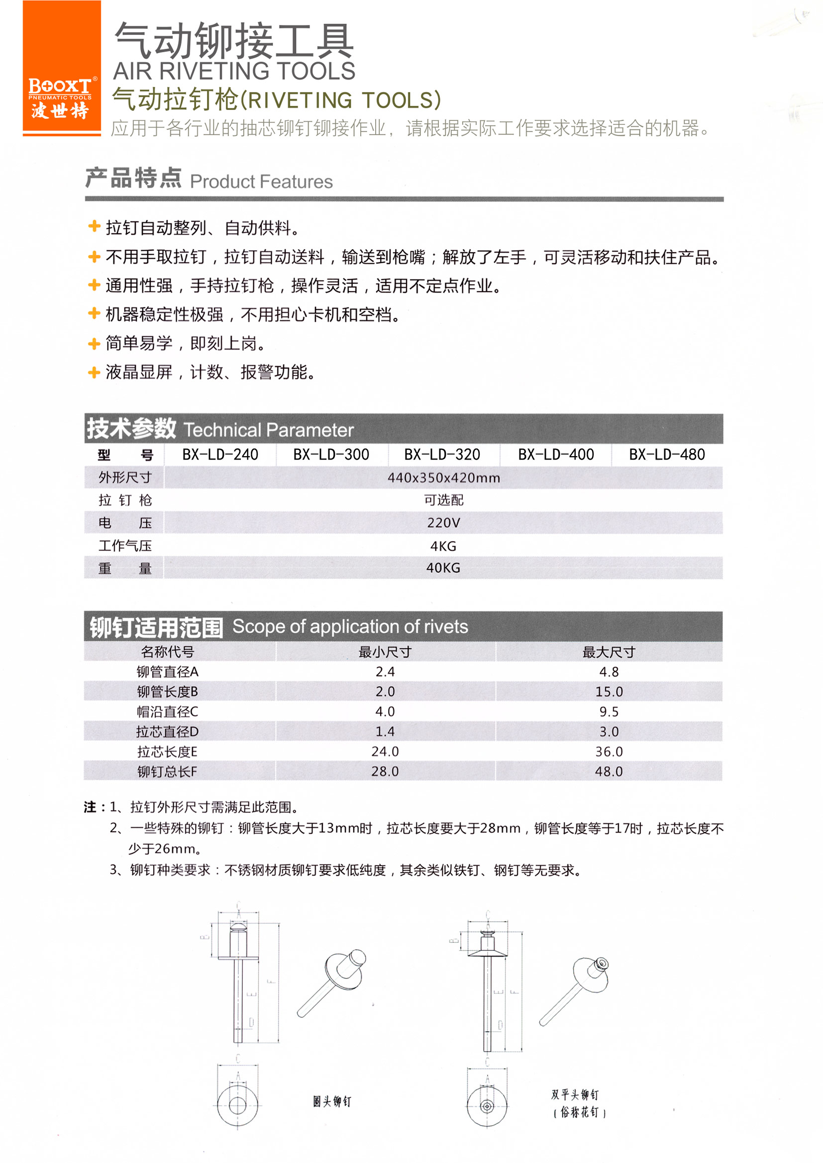 11.品種齊全,適合不同規(guī)格,不同強(qiáng)度的鉚釘。
