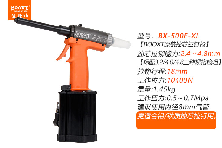 東莞市強勁五金工具有限公司提供臺灣BOOXT波世特品牌氣動工具,細管氣動拉釘槍BX-500E-XL廠家直銷,首件享特價。咨詢熱線:4008301980
