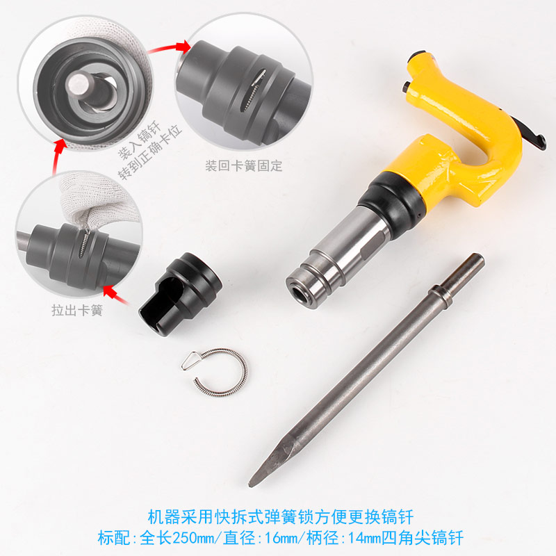 • 產(chǎn)品參數(shù): 鎬尖尺寸:R12.6*250L (標配尖鎬尖) 活塞直徑:R20*48mm 活塞沖程:58mm 打 擊 數(shù):3000bpm 工具全長:243mm 帶鎬全長:470mm (含鎬尖) 含鎬重量:2.62kg (含鎬尖) 耗 氣 量:7.4CFM【工業(yè)型】