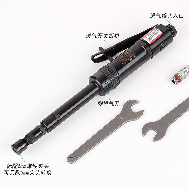 • 產(chǎn)品參數(shù): 夾頭尺寸:3,6mm;(標(biāo)配M6) 空載轉(zhuǎn)速:24000rpm; 馬達(dá)功率:0.32HP 總 長 度:308mm 桿 直 徑:19mm 桿 長 度:150mm 重 量:1.0kg; 側(cè)排氣; 耗氣量:2.8cfm/分鐘; 使用工作氣壓:0.65Mpa; 推薦使用內(nèi)徑8mm氣管; 平時(shí)使用應(yīng)多加氣動油保養(yǎng) 【扳機(jī)式開關(guān)】