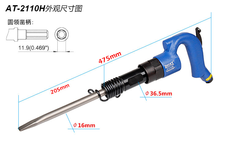 • 產(chǎn)品參數(shù): 鎬尖尺寸:H11.9*250L*20W 【標配/扁鎬頭】 活塞直徑:20*48mm 活塞沖程:58mm 打 擊 數(shù):3000bpm 帶鎬全長:475mm 含鎬重量:2.16kg (含鎬頭) 耗 氣 量:7.4cfm 【六角柄】