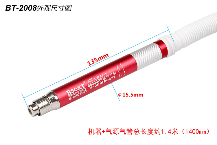 • 產(chǎn)品參數(shù): 夾頭能力:M2.3,M3 【標(biāo)配M3】 空載轉(zhuǎn)速:65000rpm 全 長(zhǎng):135mm 重 量 : 0.20kg 耗 氣 量:0.2m3/min 【經(jīng)濟(jì)型】