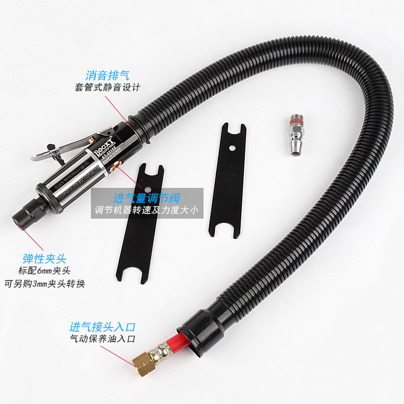 • 產(chǎn)品參數(shù): 夾頭能力:標(biāo)配M6 (選配M3) 空載轉(zhuǎn)速:25000rpm 耗 氣 量:4cfm/min 全 長:136mm 重 量 : 0.56kg;扳機(jī)式開關(guān)