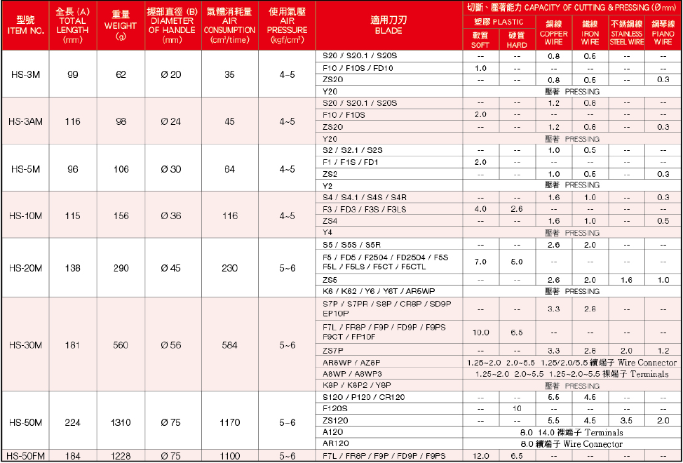 HS-3M機(jī)身更多刀頭選擇請參考下表: