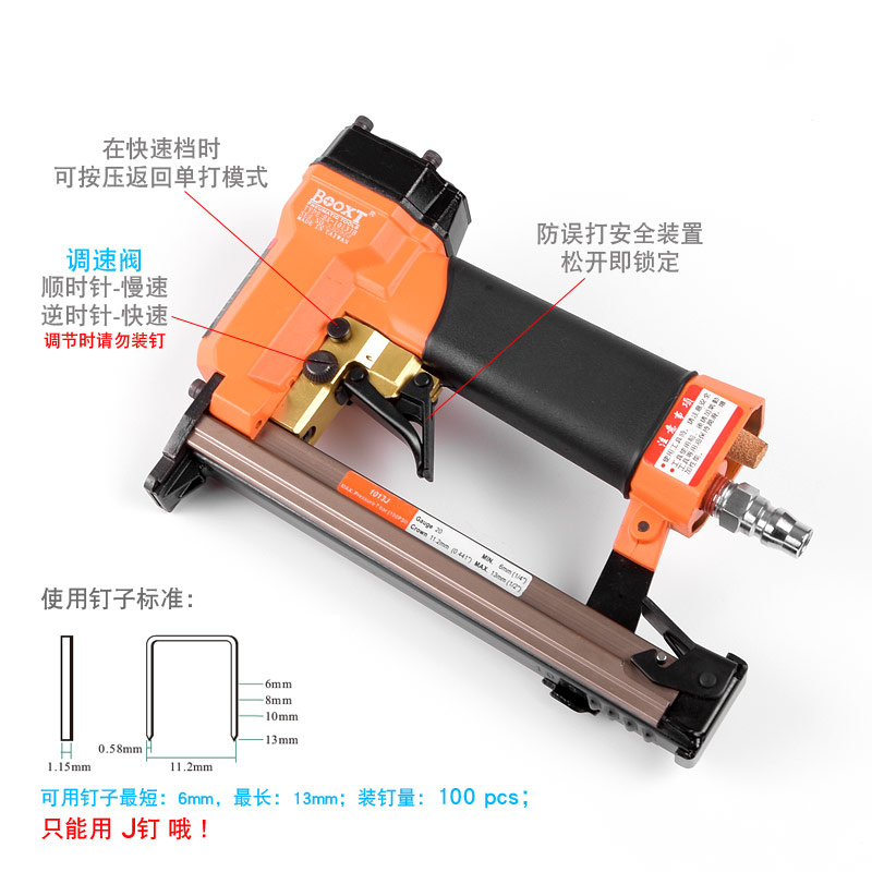 • 產(chǎn)品參數(shù): 特點(diǎn):可調(diào)節(jié)快速連打,自帶防誤打安全開關(guān);釘子寬度:11.2mm;釘子跨度:10mm;釘腳尺寸:0.58×1.15mm;使用釘子長(zhǎng)度范圍:6-13mm;裝釘量:100個(gè);使用工作氣壓:0.6Mpa;推薦使用內(nèi)徑6.5mm氣管;平時(shí)多注意定時(shí)排放空壓機(jī)水份