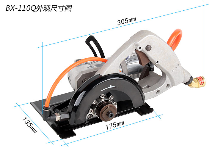 • 產(chǎn)品參數(shù): 產(chǎn) 品 型 號(hào):BX-110Q(側(cè)排氣) 切割片尺寸:114mm 切割片孔徑:20mm/22mm 最大切割深度:30mm 空 載 轉(zhuǎn) 速:6500rpm 馬 達(dá) 功 率:470W(0.63HP) 機(jī) 身 長(zhǎng) 度:330mm 重 量:2.92kg 耗 氣 量:0.5立方米/分鐘 噪 音 值:85db 進(jìn) 氣 口:1/4" 推薦使用氣管:內(nèi)徑8mm 使用工作氣壓:0.63Mpa